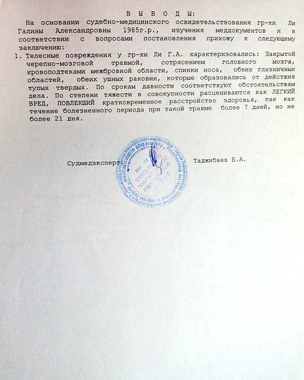 Подруга сразу повезла меня в городское отделение милиции (ГОМ), чтобы я написала заявление. Следователь поступил очень некрасиво, он нарушил ряд норм, потому что дал мне направление на судебно-медицинскую экспертизу, но заявление не принял. Потом мне сказали прийти в 09.00 часов утра на освидетельствование. На следующий день мне сняли побои. Я просила перевести дело из ГОМа в районное отделение внутренних дел, потому что следователь, который вел дело, постоянно говорил мне: «Ну что ты мне все время звонишь? Я же сказал, что скажу, когда все будет готово». Он вел себя крайне нагло.