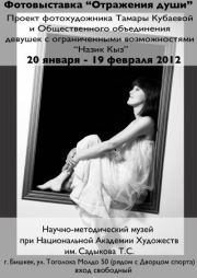 В Бишкеке 20 января откроется фотовыставка «Отражение души» — совместный проект фотохудожницы Тамары Кубаевой и Общественного Объединения девушек с ограниченными возможностями здоровья «Назик кыз». Об этом в интервью K-News сообщила участница проекта Азиза Иминова.