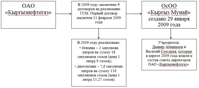 Согласно отчету и заключению межведомственной комиссии, образованной распоряжением правительства КР от 3 июня 2011 года, по итогам ревизии финансово-хозяйственной деятельности ОАО «Кыргызнефтегаз» сумма занижения цен на реализованные в 2009 году и в 1 квартале 2010 года нефтепродукты составила 258 миллионов 231 тысяч 143 сома. Из них на бензин – 87 миллионов 771 тысяча 549 сомов, на дизельное топливо – 91 миллионов 123 тысячи 560 сомов, на мазут – 79 миллионов 336 тысяч 34 сома. Отметим, что 85 % акций ОАО «Кыргызнефтегаз» находятся в госсобственности.