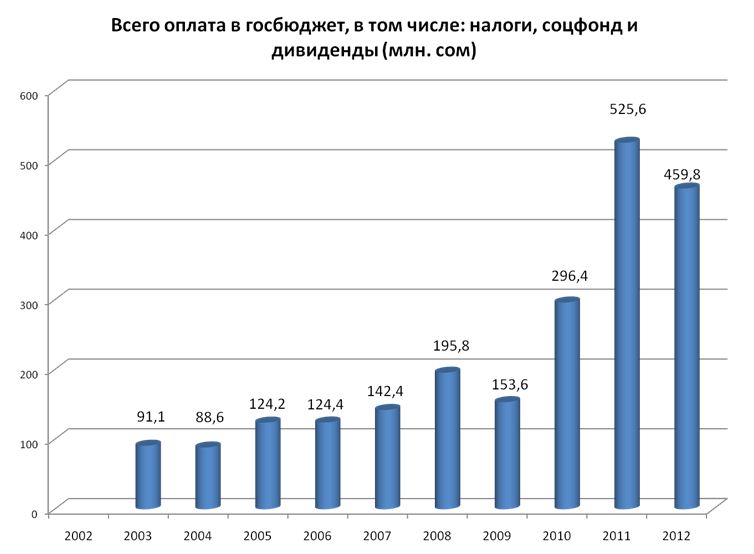 В 2009 году выплаты в государственный бюджет в виде налогов, отчислений в Социальный фонд и дивидендов составила 153,6 миллиона сомов, а в 2010 году – 296,4 миллиона сомов, в 2011 году – 526 миллионов сомов.