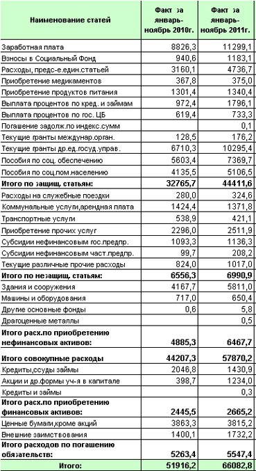 В период с января по ноябрь 2011 года расходы республиканского бюджета составили 66 миллиардов 82 миллиона 800 тысяч сомов или 96,5 % от плана. Такие данные накануне, 7 декабря, предоставили в Министерстве финансов.