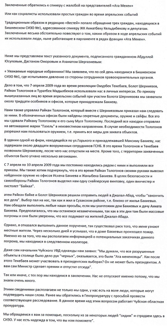 В видео, снятом одним из телеканалов страны, фигурируют имена политиков от фракции «Ата-Мекен». Захватчики рассказали, что действовали по приказу Омурбека Текебаева, Туратбека Мадылбекова и Райкана Тологонова (все — «Ата Мекен»).