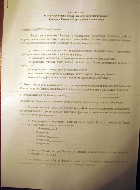 Проект коалиционного соглашения, разосланного во все фракции Жогорку Кенеша, состоит из 23-х пунктов и рассчитан на подписание четырьмя фракциями. В проекте приведены основные положения внешней и внутренней политики Кыргызстана, а также роль парламентской коалиции в их реализации.