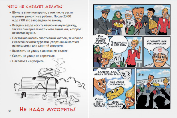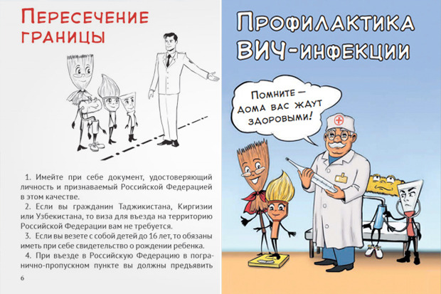 Так, мигранты в брошюре предстают в виде шпателей, веников, кистей для краски.