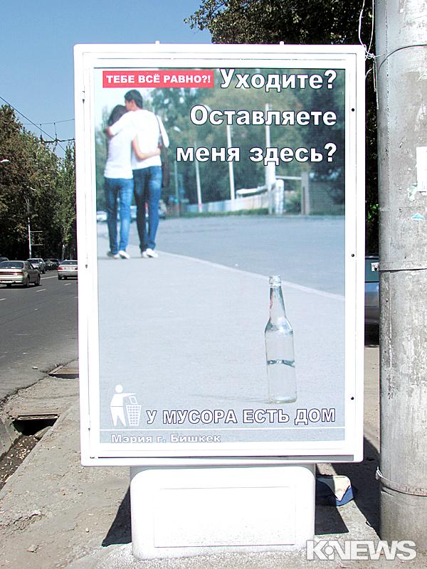 Мэрия разместила на улицах Бишкека специальную соцрекламу со следующим текстом: «Уходите? Оставляете меня здесь? У мусора есть дом». Всего установлено 5 световых коробов с соцрекламой на пересечении следующих дорог: