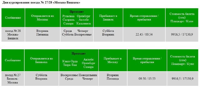 Расписание поездов, курсирующих по Кыргызской железной дороге с 27-ого мая 2013 года. Указано московское время.