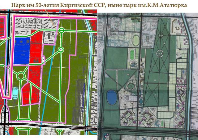 Парк «Ата Тюрк» (Красным цветом закрашена часть парка, территория которого находится либо в аренде, либо выкуплена и уже застроена частными постройками).