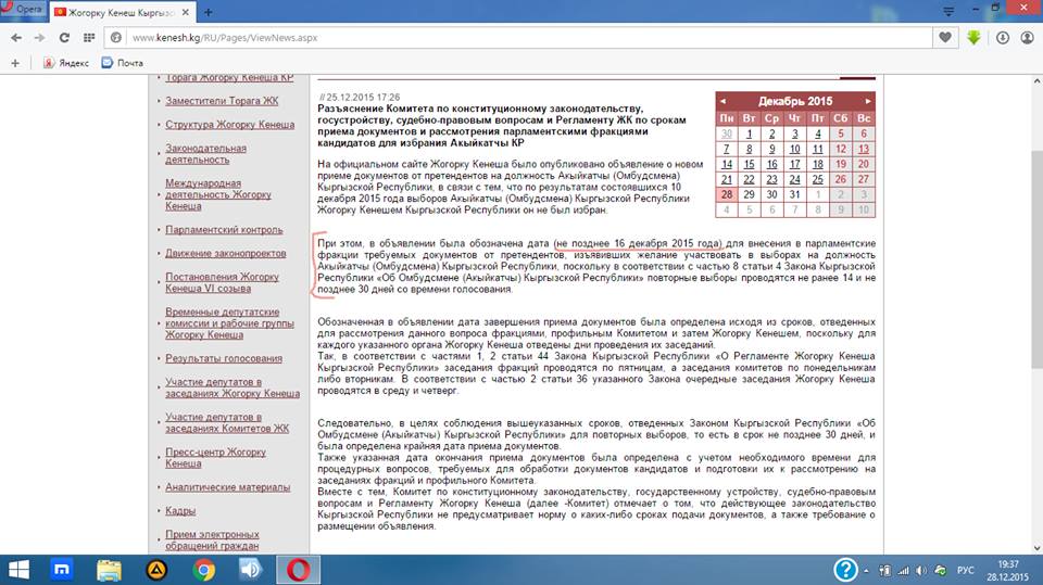 Как отмечает адвокат Искен Афиджанов, «в разъяснении комитета по конституционному законодательству, государственному устройству, судебно-правовым вопросам и Регламенту ЖК от 25 декабря 2015 года, подтверждено, что в ранее размещенном на официальном сайте ЖК КР объявлении о приеме документов в парламентские фракции от кандидатов в омбудсмены указана дата их сдачи – не позднее 16 декабря 2015. Естественно, что напрашивается вопрос: неужели лидер правящей партии страны говорит неправду? Неужели Турсунбеков не знает, что граждане и кандидаты ориентируются именно по информации и объявлениях, размещенных на официальном сайте законодательного органа страны?» — задается вопросами юрист.