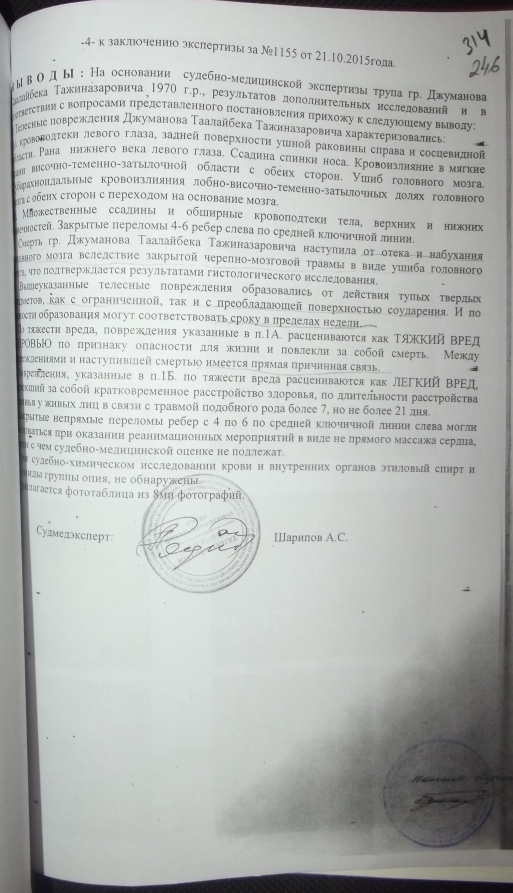 «Смерть Таалайбека Джуманова наступила от отека и набухания головного мозга вследствие закрытой черепно-мозговой травмы в виде ушиба головного мозга, что подтверждается результатами гистологического исследования», — говорится в заключении судмедэксперта.