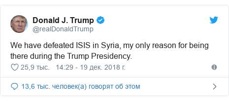 «Мы победили ИГИЛ , это была единственная причина оставаться там во время президентства Трампа», — написал он в «Твиттере», вскоре после того, как телекомпания Си-эн-эн сообщила, что Вашингтон планирует «полный и быстрый» вывод войск.
