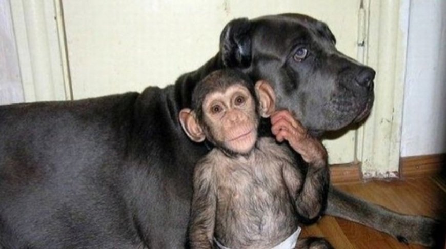 Когда маленький шимпанзе попал в компанию щенят и собаки — они сразу стали знакомится: собака стала обнюхивать шимпанзе и знакомится с ним. Через некоторое время собака приняла этого малыша как своего детёныша. Шимпанзе тоже принял собаку, как свою маму.