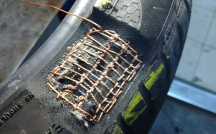 - Из аналогичной шины вырезается кусок резины с неповрежденным кордом, по размеру и форме максимально совпадающий с отсутствующим участком в ремонтируемой шине.