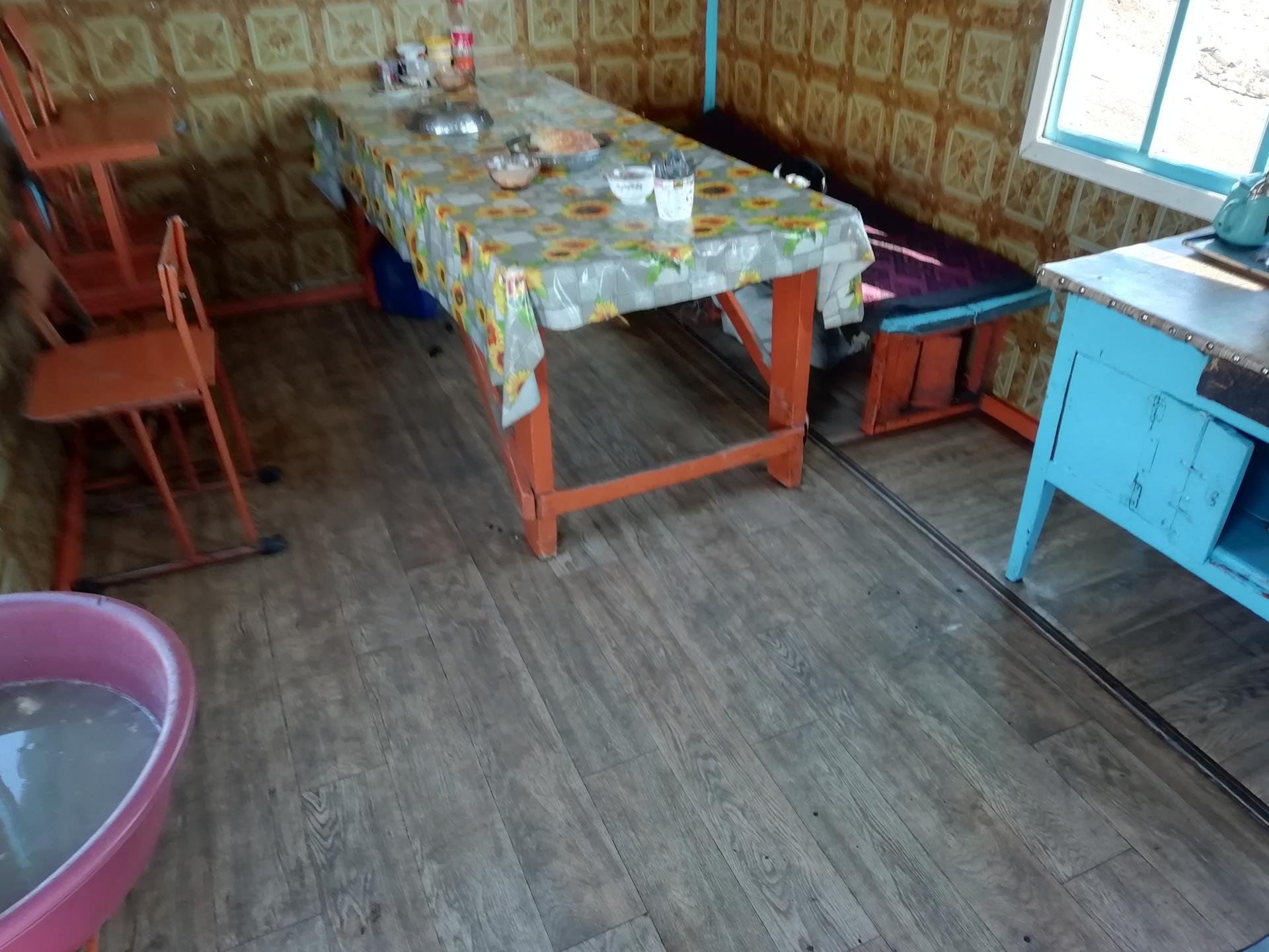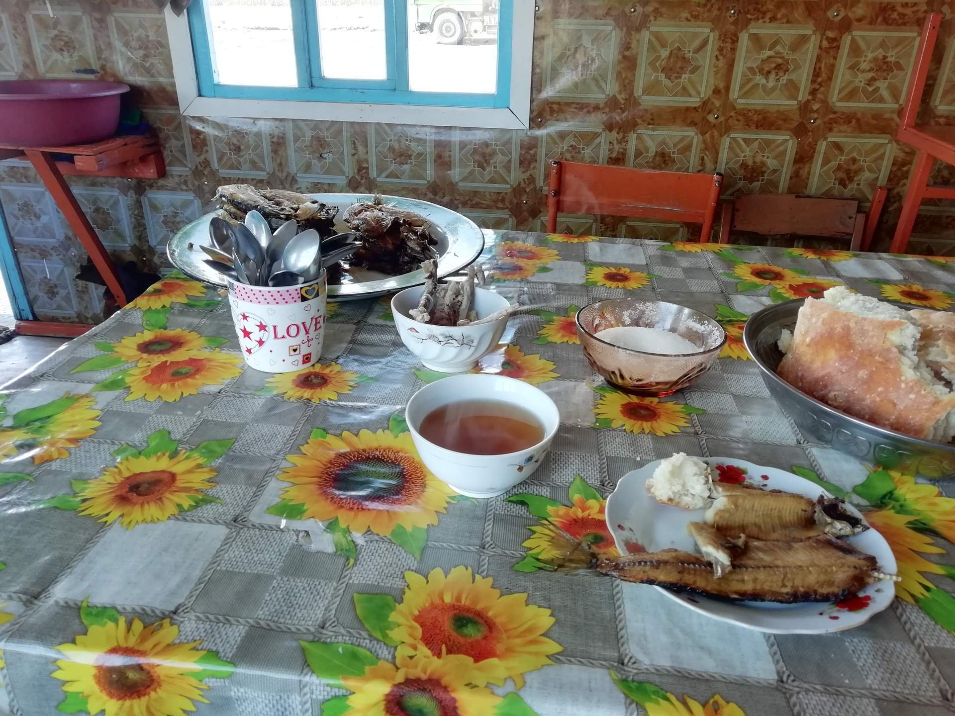 Обстановка в этих едальнях довольно спартанская. Вагон разделен на две части. В одной находится зал для гостей, в котором есть деревянный стол, накрытый красивой разноцветной клеенкой, деревянная скамейка и пара стульев. На входе около двери стоит тазик, в котором можно помыть руки. В другой части вагончика располагается кухня, в которой и жарят рыбу.