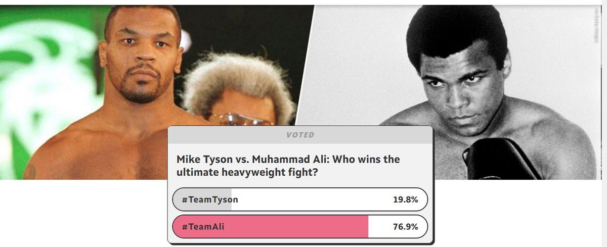 С Тайсоном согласно большинство, которое приняло участие в непрерывном онлайн-голосовании, призванном выявить, кто из боксеров был лучше. Его результаты выглядят так: