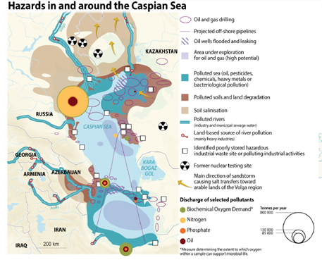 Каспийское море – это крупнейший замкнутый водоем на Земле. После распада Советского Союза в 1991 году и начала эксплуатации крупных месторождений нефти и газа водоем превратили в довольно важный геополитический и экономический объект. Все это привело к тому, что экологическое положение озера оказалась под угрозой из-за добычи нефти и природного газа, а также загрязнения рек из-за отходов жизнедеятельности различных отраслей промышленности, в том числе химической и горнодобывающей. Влияют на этот процесс в связи с ростом населения городов, окружающих Каспийское море, и бытовые отходы.