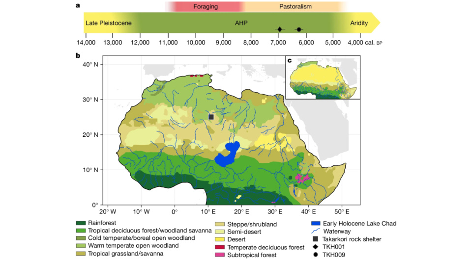 Начавшиеся около 14,5 тысячи лет назад изменения привели к тому, что климат в северной части Африки стал заметно влажнее, чем сегодня. В результате этого на протяжении долгого времени — примерно до пяти тысяч лет назад — на многих землях, которые сейчас занимает Сахара, росли трава, кустарники и деревья, существовали постоянные водоемы и обитали разнообразные дикие животные. Поэтому неудивительно, что в тот период, часто называемый «зеленой Сахарой», на ныне безжизненных пространствах селились и люди: сначала — охотники-собиратели-рыболовы, а затем и животноводы.