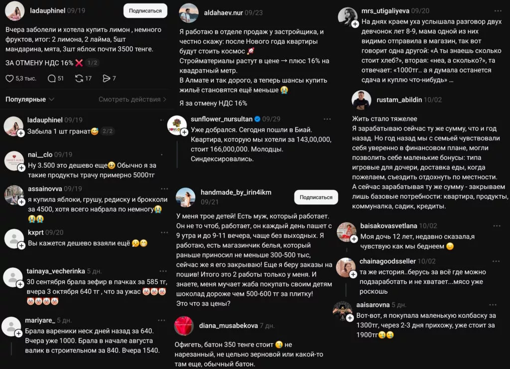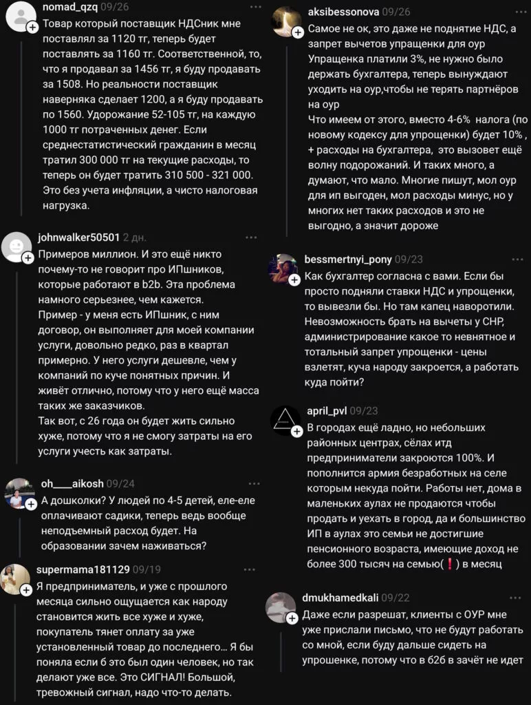 «Что касается конечной стоимости: вы упускаете тот момент, что НДС уплачивается буквально на всех этапах производства, логистики, реализации. В совокупности это даёт прирост стоимости на 15-20 %. Теперь наглядно: идёте в супермаркет, и корзина, которая обходилась вам в 20 тысяч тенге, теперь уже стоит около 25 тысяч тенге. Что, всё ещё мелочи? Окей. Есть сфера услуг и транспорт, например: где люди что-то кушают, на чём-то ездят. И всё комплексно впишется в разгон инфляции. В общем, хорошего очень мало в этом».