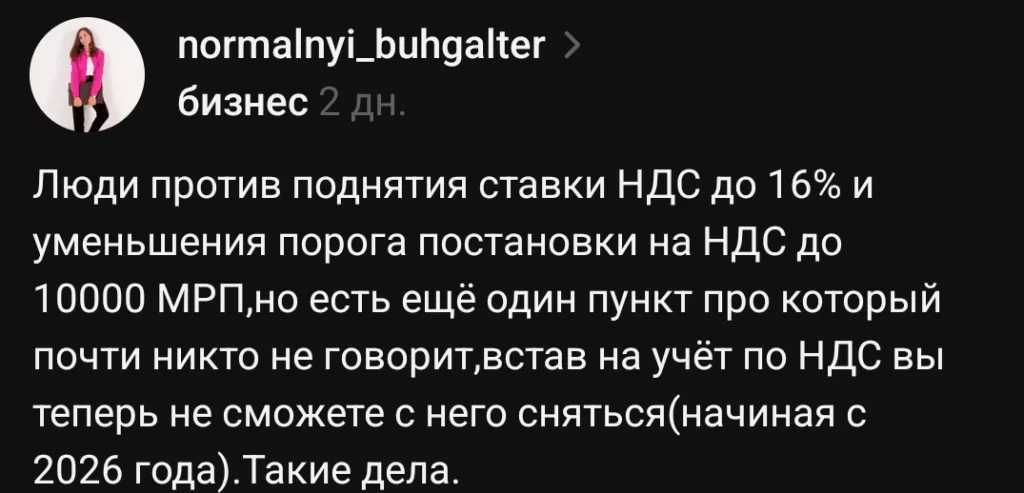 «Мы вошли в список организаций без упрощенки. Образование, коррекционный центр. Как нам быть? Коллеги, нужно что-то делать. Поднимать цены нереально, зарплаты не растут. И так тяжело родителям. У нас услуги, нет взаимовычета, и в себестоимость 100 % ложится зарплата. Уже сейчас сотрудники жалуются на рост цен на продукты и просят поднять оклад».