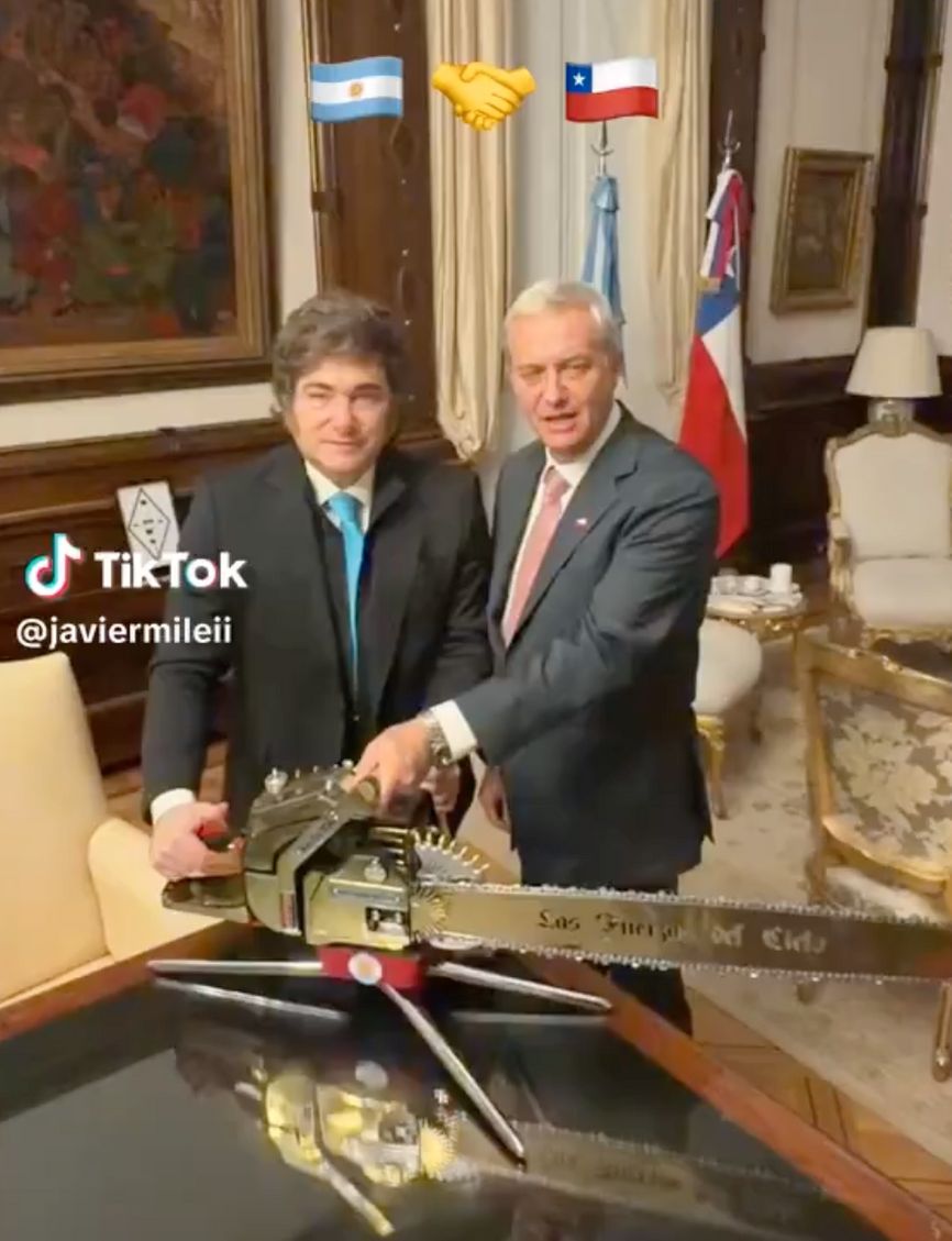 Милей опубликовал в TikTok видео, на котором президенты Милей и Каст с бензопилой сообщают: «Есть одна хорошая новость: свобода наступает по всей Латинской Америке. Да здравствует свобода, черт возьми!»