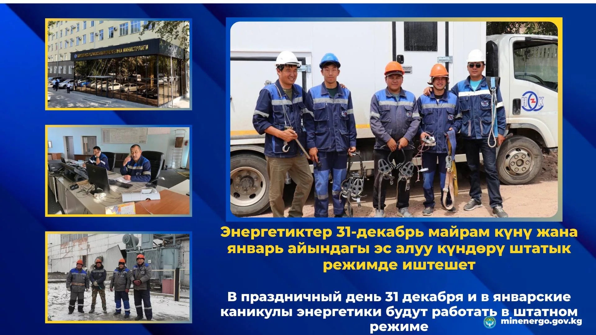 В соответствии с поручением Министерства энергетики Кыргызстана, в целях бесперебойного обеспечения населения электроэнергией, в новогодний праздничный день 31 декабря, а также в январские каникулы, по республике руководство и сотрудники энергокомпаний будут работать в штатном режиме.