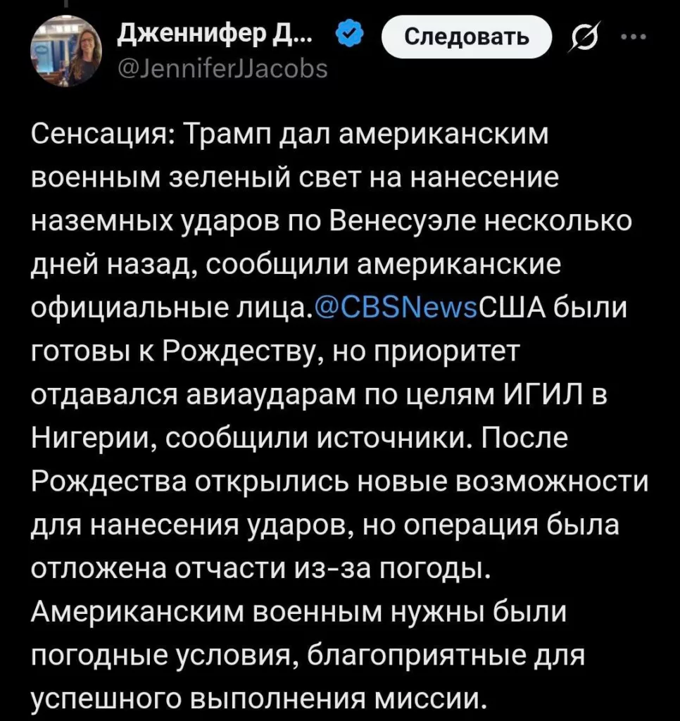 Президент США Дональд Трамп отдал приказ о нанесении ударов по объектам на территории Венесуэлы, включая военные объекты, сообщили американские официальные лица американскому партнеру BBC, телеканалу CBS News.