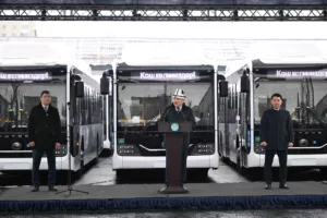 «Сегодня мы передаем мэрии Бишкека 95 новых современных автобусов, а также 42 единицы специальной техники. Это ещё один важный шаг в обновлении общественного транспорта и городских служб. В рамках последовательной работы мэрии города Бишкек приоритетом остаются развитие города, улучшение экологической обстановки и создание комфортных условий для жителей. В целях улучшения экологии высажено более 17 тысяч деревьев, расширены зелёные зоны. Начал свою работу современный экотехнологический завод по утилизации твердых бытовых отходов и выработке электроэнергии.