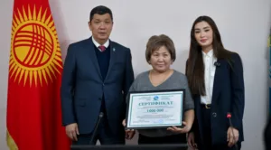 Сертификаты вручили мэр города Бишкек Айбек Джунушалиев и директор Бишкекского филиала Государственной страховой организации Алима Нурланова.