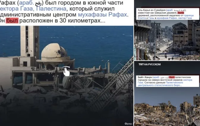 Англоязычная версия Википедии теперь называет несколько городов Газы, включая Рафах, Бейт-Ханун, Аль-Карья-ас-Сувайдия и Ом-аль-Наср, «бывшими» местами, используя прошедшее время. Такое описание несет в себе риск нормализации стирания, подразумевая, что эти объекты больше не существуют в значимом смысле. Это потенциально представляет геноцид и депопуляцию как окончательный, свершившийся факт. Об этом сообщает TRT.