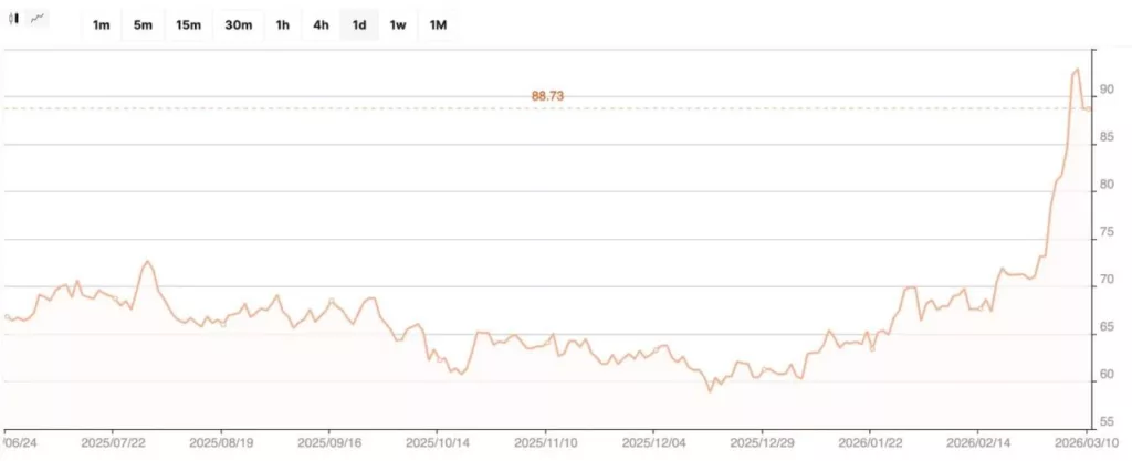 В конце февраля 2026 года США и Израиль провели авиаудары по объектам на территории Ирана. Ответные действия со стороны Тегерана резко усилили напряжение в регионе. Одним из наиболее важных факторов для нефтяного рынка стало решение Ирана закрыть Ормузский пролив — стратегический маршрут, через который проходит около 20% мировой морской торговли нефтью. На фоне атак на энергетическую инфраструктуру и угроз безопасности судоходства инвесторы начали закладывать в цены риск сокращения мировых поставок. Усиление неопределенности традиционно приводит к росту котировок, поскольку участники рынка готовы платить более высокую цену за баррель, опасаясь резкого снижения предложения «черного золота».