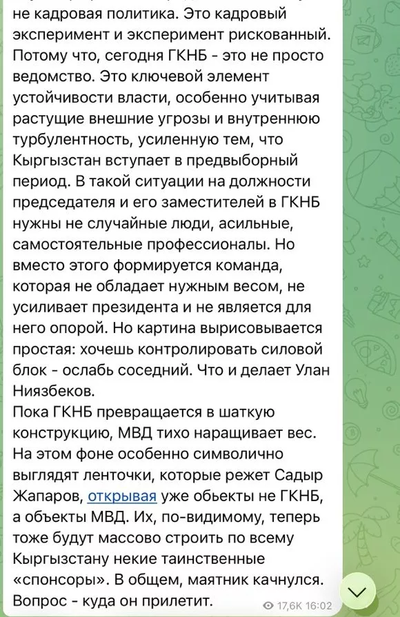 В последнее время в информационном пространстве и социальных сетях распространяются публикации, содержащие критику кадровых решений в силовом блоке Кыргызстана.