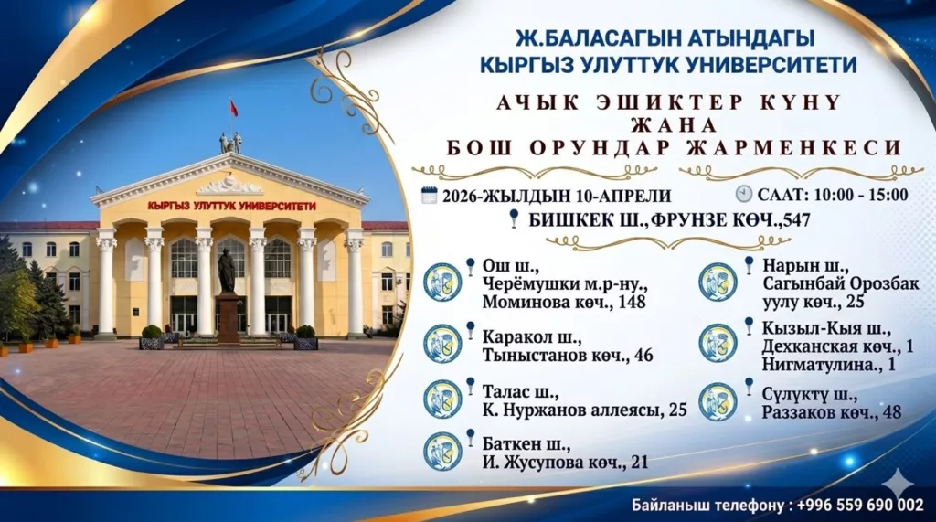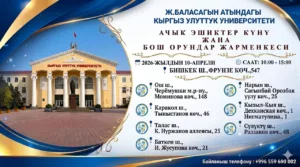 10 апреля 2026 года Кыргызский национальный университет имени Жусупа Баласагына проводит масштабное профориентационное мероприятие «Я выбираю будущее», в рамках которого также состоится «День открытых дверей» для абитуриентов.