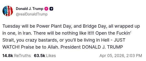«Во вторник будет День электростанций и День мостов — все сразу, в Иране. Такого вы еще не видели!!! Откройте, б..дь, пролив, вы сумасшедшие ублюдки, иначе будете жить в аду — ПРОСТО СМОТРИТЕ! Хвала Аллаху. Президент ДОНАЛЬД ДЖ. ТРАМП», — написал Трамп в своей сосцсети Truth Social.