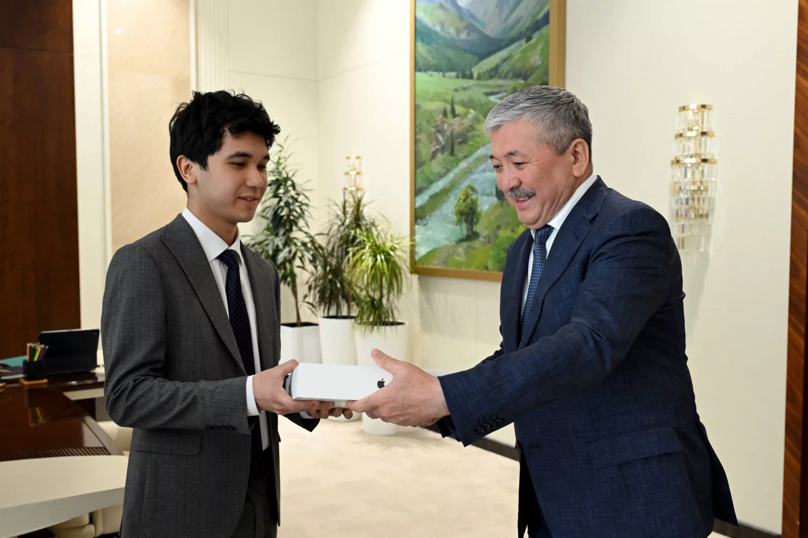 В завершение встречи Адылбек Касымалиев пожелал дальнейших успехов в учебе и новых достижений и вручил ему памятный подарок.