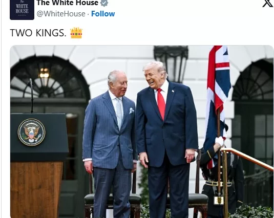 На фотографии, сделанной во время официального приветствия американской администрацией короля Карла III и королевы Камиллы и опубликованной в официальном аккаунте Белого дома в Х, президент США Дональд Трамп и король смеются, стоя на лужайке у Белого дома.